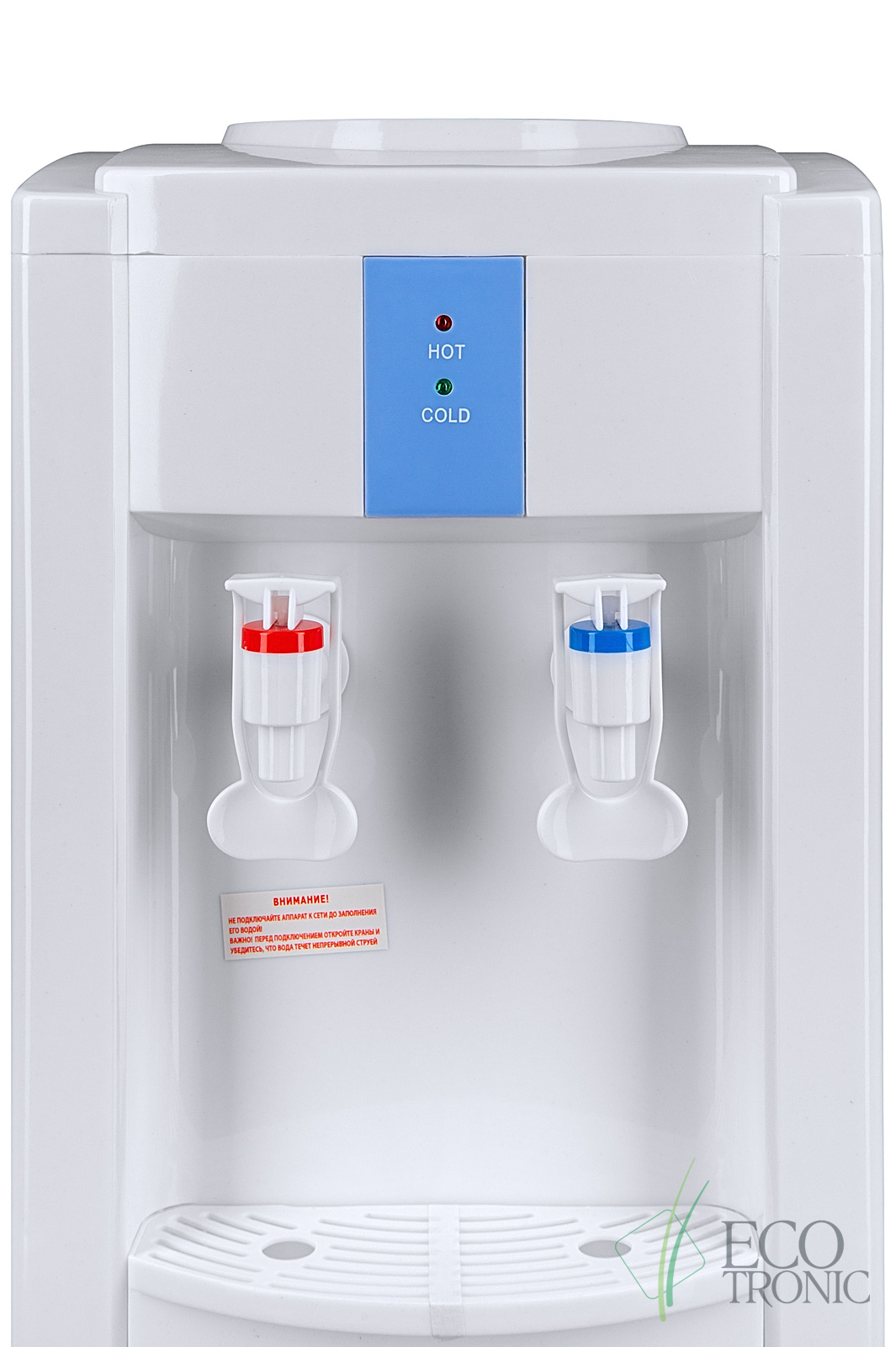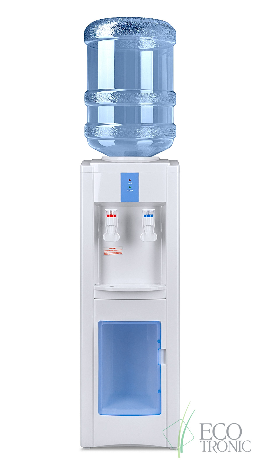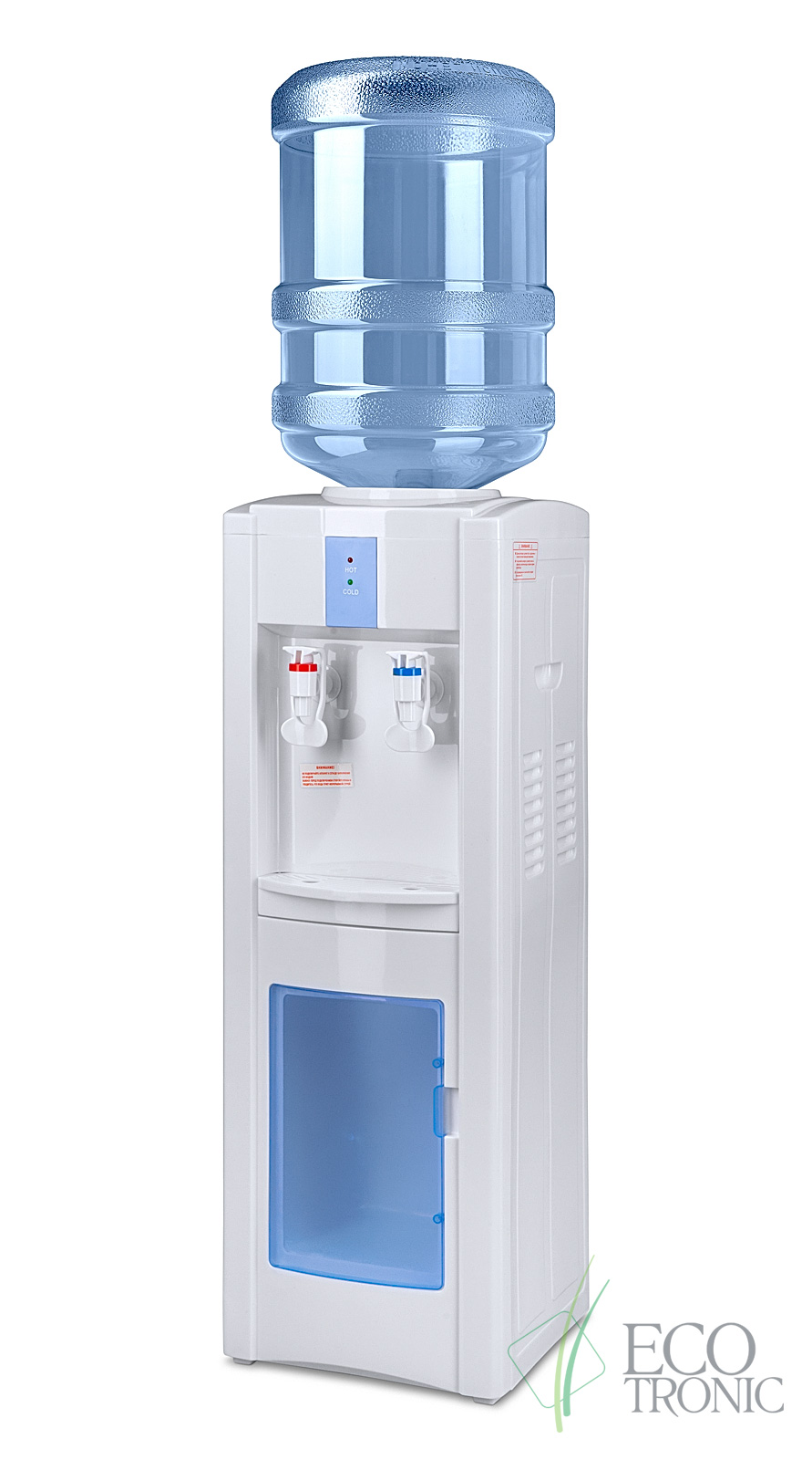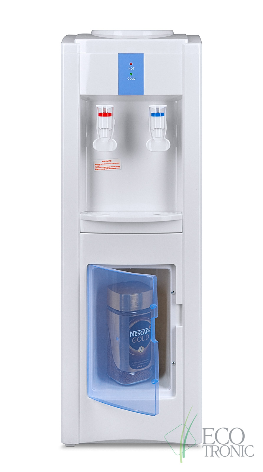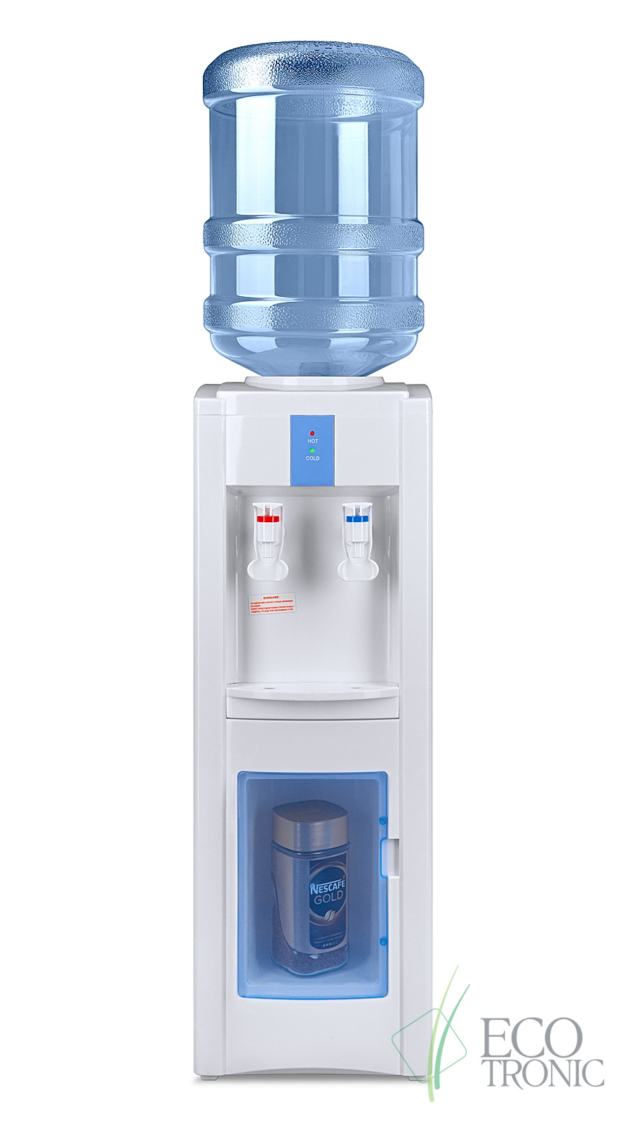 Компактный кулер Ecotronic V12-LCE XS со шкафчиком для хранения. Напольная модель небольшого размера, легко вписывается в любой интерьер. Электронное охлаждение. Корпус белого цвета с голубыми вставками. Индикация режимов нагрева и охлаждения воды. Краны «нажим кружкой».